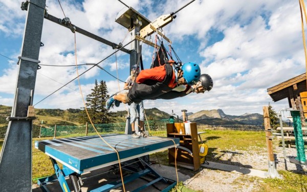 After asking you if you are ready and getting an affirmative answer to this, you will hear a click which is the safety cable detaching and your flight beginning. The speed increases rapidly and with a speed of about 100 km/h you will fly over the valley, over the hamlet/town of Plaine-Dranse. Below you can see loads of little doll-like people skiing in the winter or hiking in the summer. The time flies when you’re having fun and before you know it you will have travelled 1200 meters and approach the end point. The Fantasticable stops within a few seconds due to a huge spring construction. After stopping you will be freed from the harness.