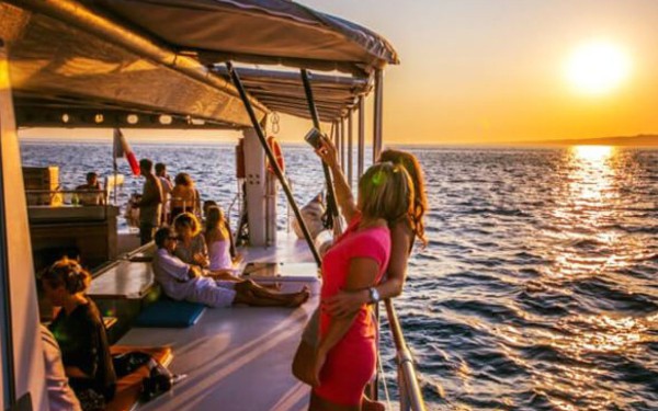 Different types of boats sail during the cruises. There are passenger boats where you can sit in or outside on the deck. It is also possible to sail in an aquascope. This is a boat with windows below the water surface or a glass bottom. You can see the underwater life of the Mediterranean as fish swim by. A third variant is a large catamaran. If there is enough wind, the sails are hoisted. The engine is started in case of insufficient wind.