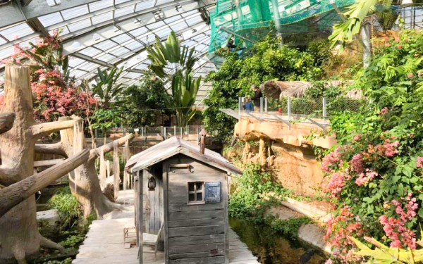 Planète des Crocodiles is gevestigd in een gebouw met een enorme glazen koepel. In het gebouw is een botanische tuin van 5.000m2. Er staan meer dan honderd verschillende soorten exotische planten en bomen als de papaja, mango, banaan, guave en avocadopalmen en kokospalmen. Daarnaast ook de reuzenbamboe, orchideeën en baobab. De tropische kas van meer dan 5.000m2 waar verschillende biotopen worden nagebootst is wat omvang betreft uniek in Europa.